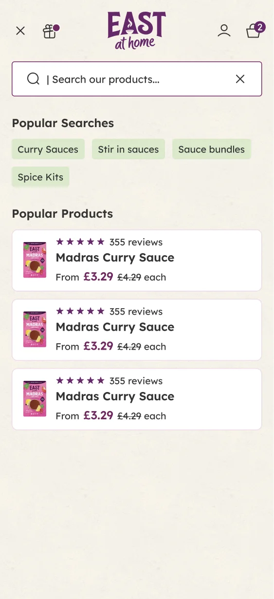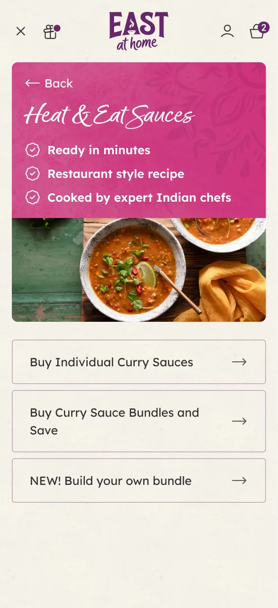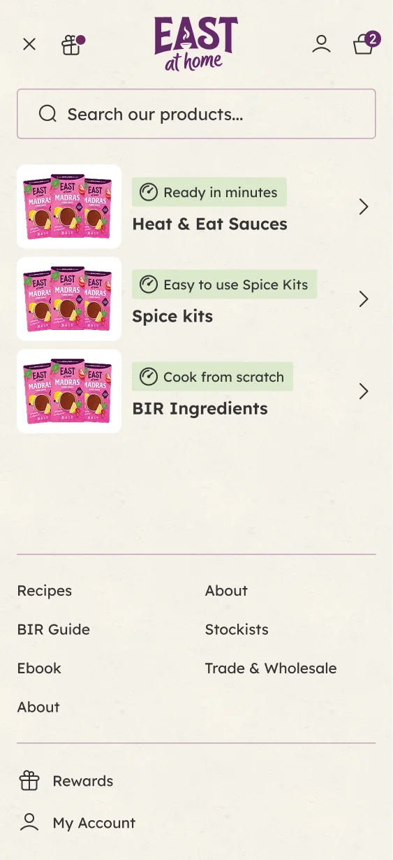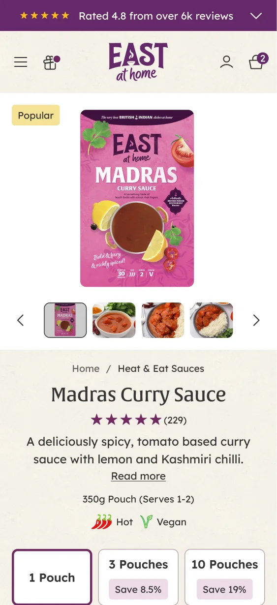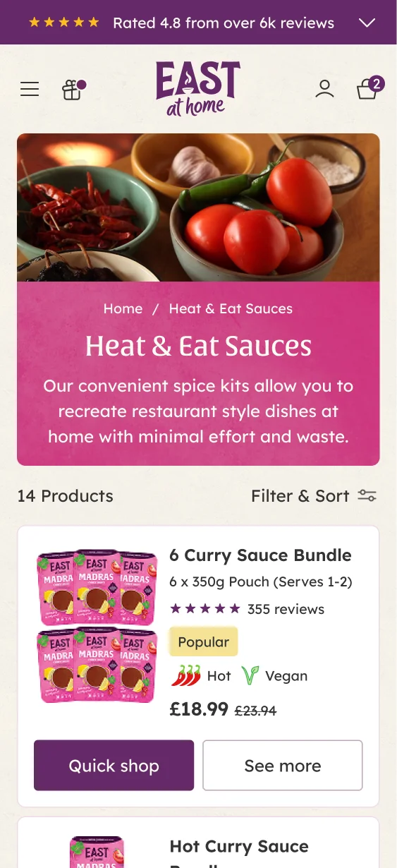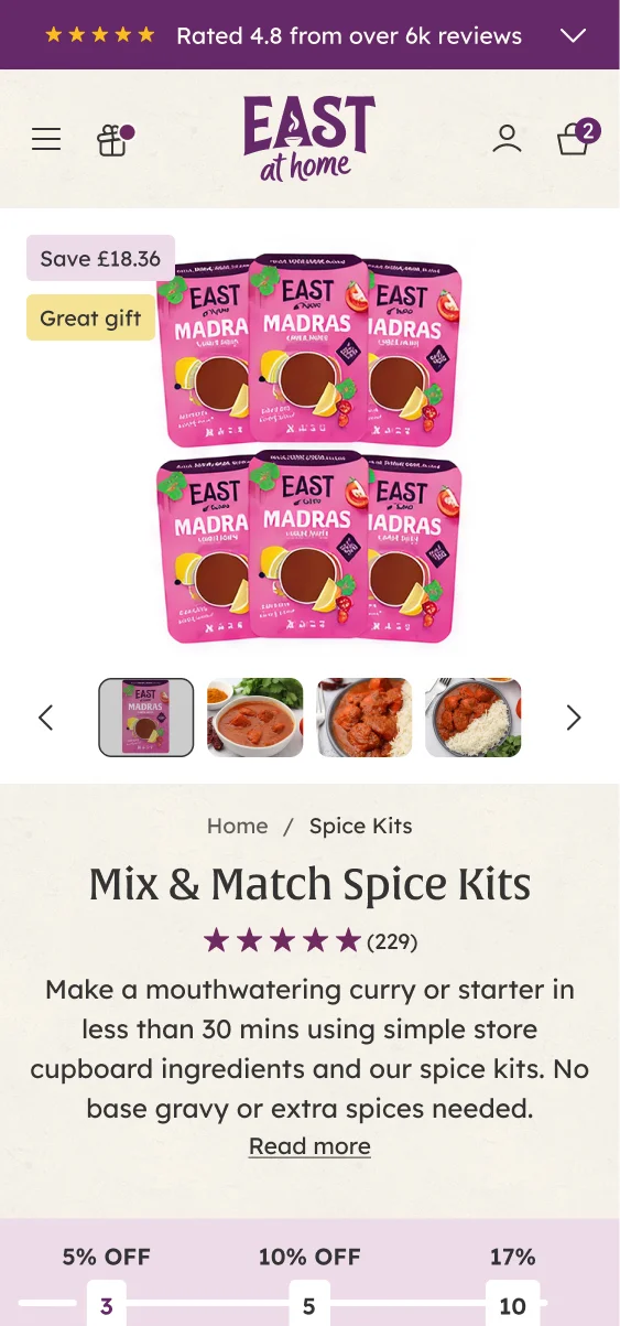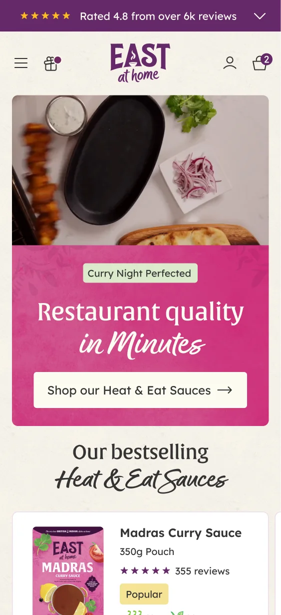 East at Home is on a mission to make restaurant-quality curries achievable at home, with a range of stir-in sauces and spice kits inspired by authentic Indian recipes. With bold new branding and packaging in place, they needed a Shopify website that could reflect that confidence and work harder commercially. They came to me looking for a Shopify UX specialist who could improve the customer experience, protect an already healthy conversion rate, and unlock further growth through increased average order value. The result was a conversion-focused redesign built around a comprehensive design system and fully clickable Figma prototypes, creating a Shopify platform designed to scale.