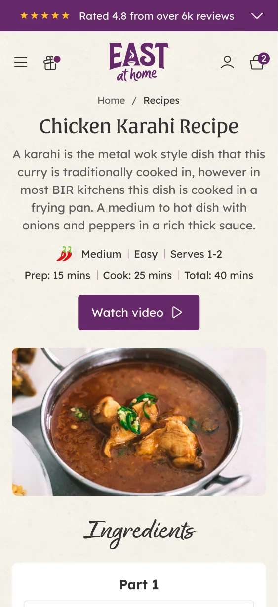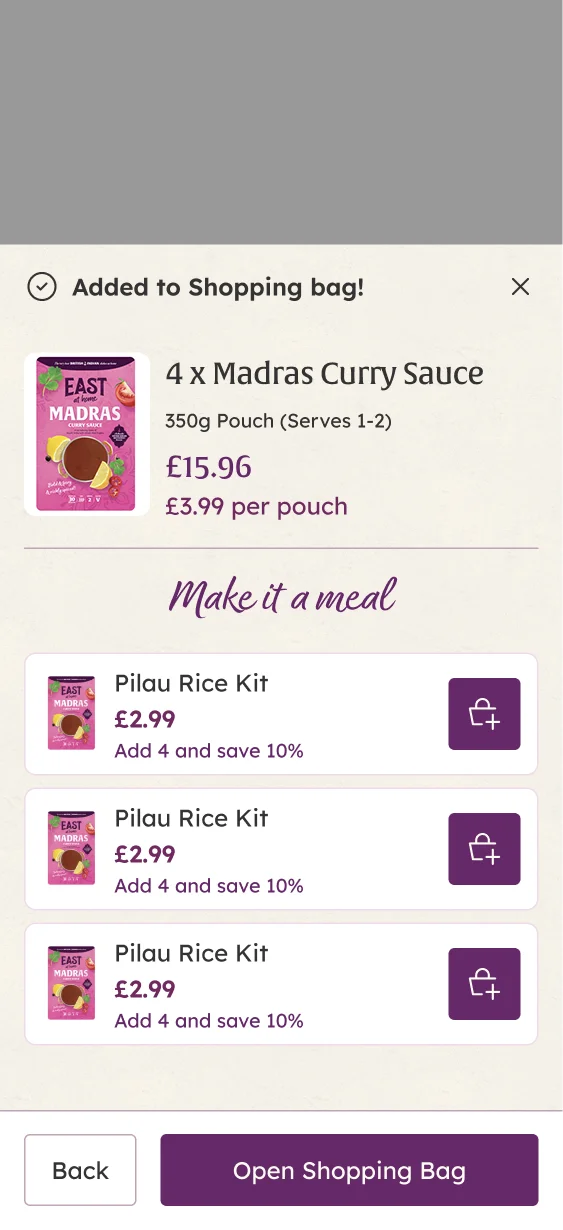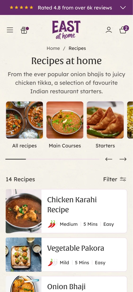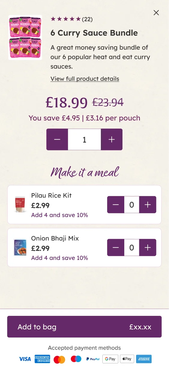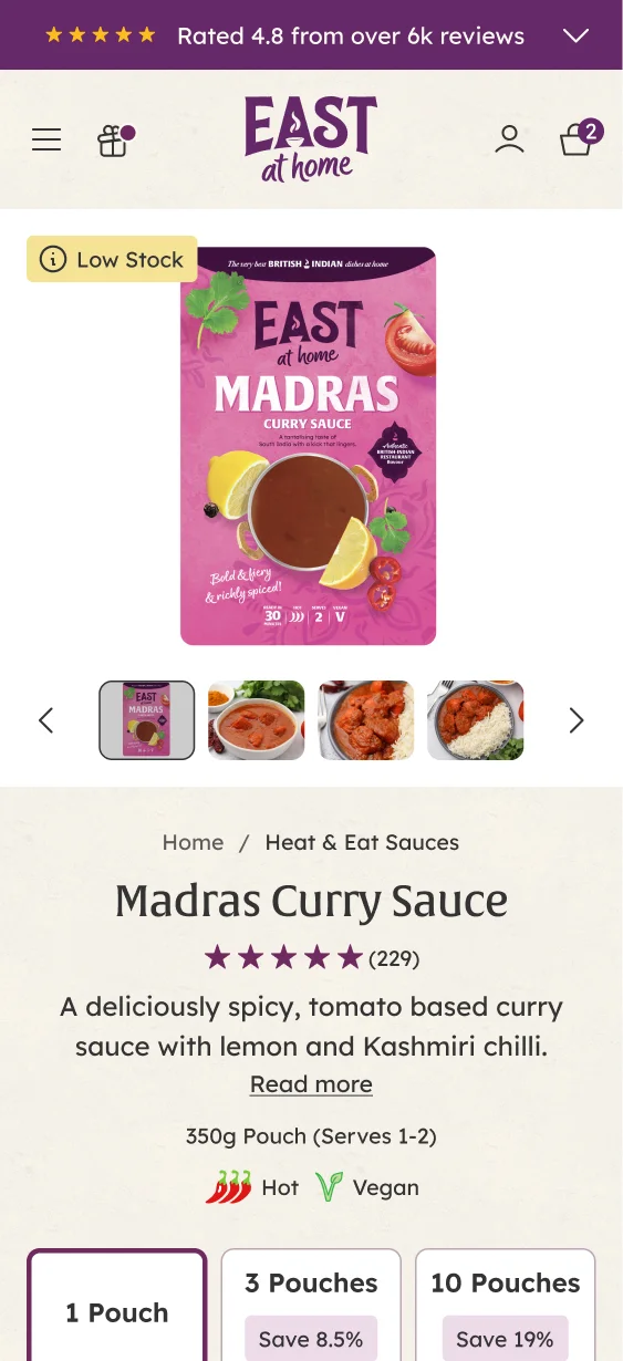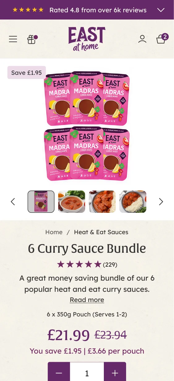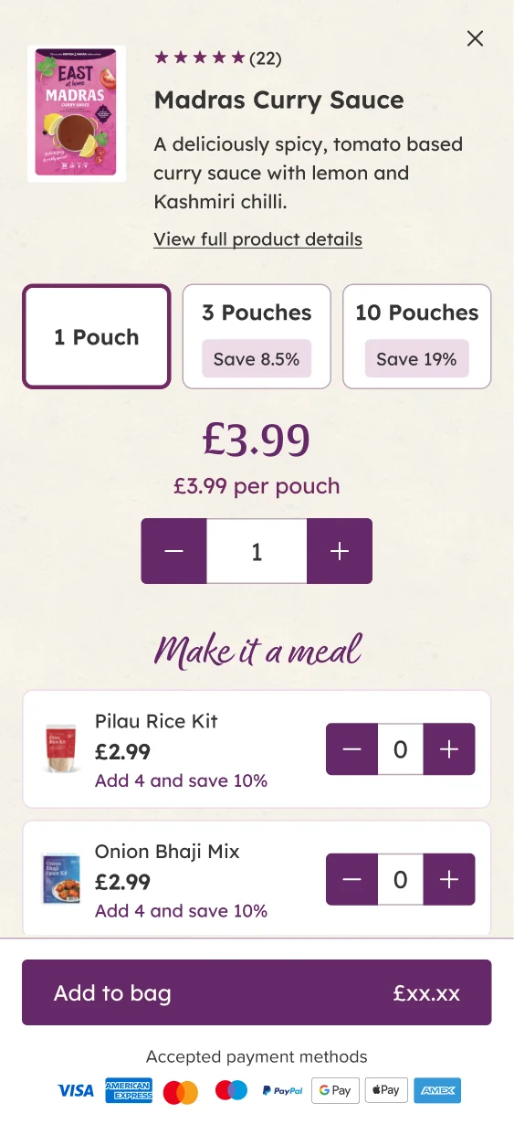 East at Home is on a mission to make restaurant-quality curries achievable at home, with a range of stir-in sauces and spice kits inspired by authentic Indian recipes. With bold new branding and packaging in place, they needed a Shopify website that could reflect that confidence and work harder commercially. They came to me looking for a Shopify UX specialist who could improve the customer experience, protect an already healthy conversion rate, and unlock further growth through increased average order value. The result was a conversion-focused redesign built around a comprehensive design system and fully clickable Figma prototypes, creating a Shopify platform designed to scale.