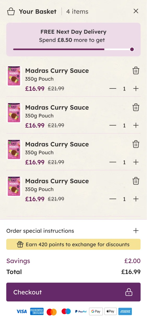 In the shopping bag, I introduced a two-tier progress bar that incentivised larger orders: