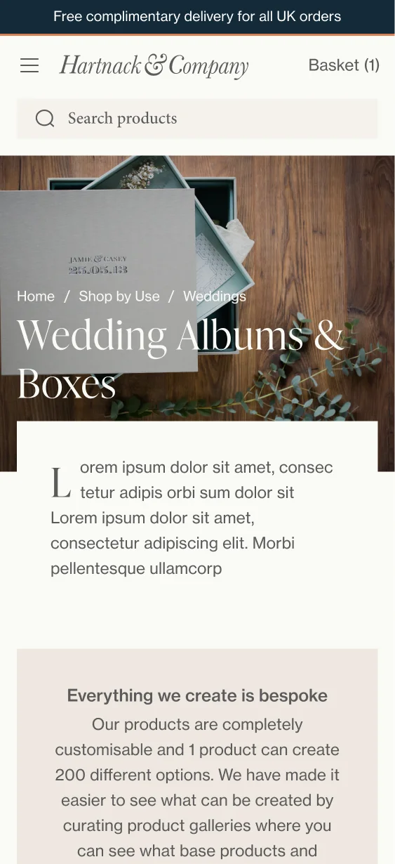 The centrepiece of the project was a fully bespoke product page, designed to handle thousands of variations without ever overwhelming the customer. The customisation journey was carefully structured into clear sections that guided users step by step, supported by a clean and elegant interface with calming typography and balanced layouts. Slide-up overlays and subtle tips provided extra guidance without breaking the flow, while bespoke icons helped to simplify complex options visually. A sticky cost tracker updated dynamically throughout the process, giving customers confidence and control over their choices.