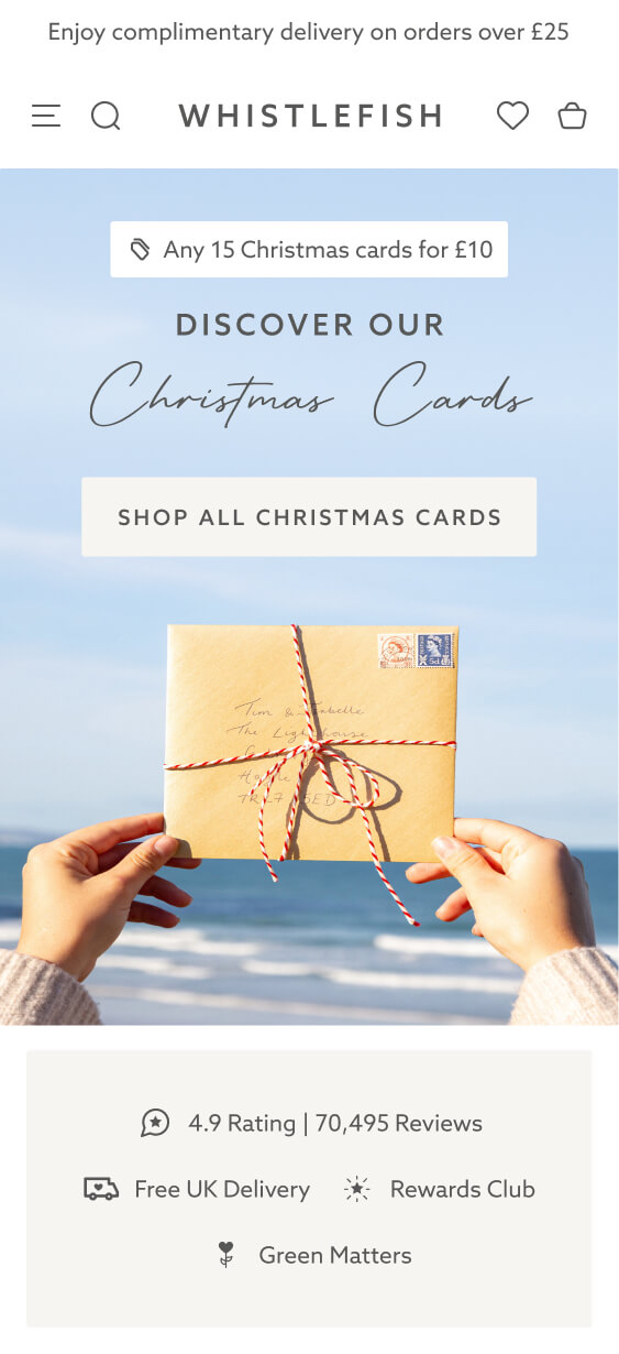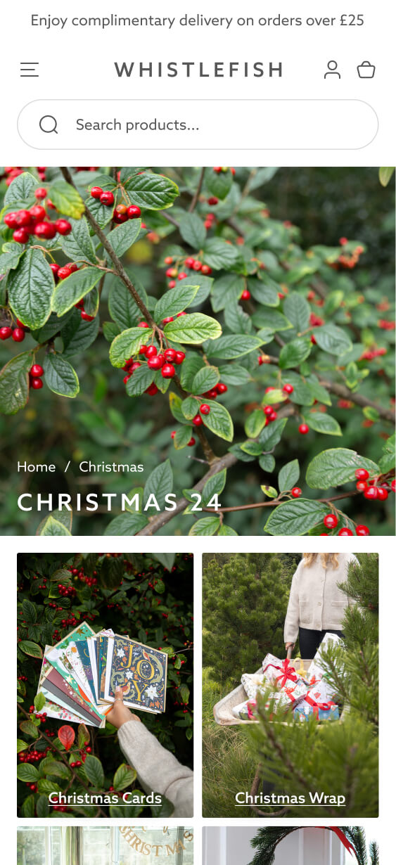 To demonstrate the flexibility of the new system, I created a Christmas landing page concept. This included curated collections, seasonal imagery, and offers. This helped show how Whistlefish could roll out future campaigns quickly without needing a full redesign each time.