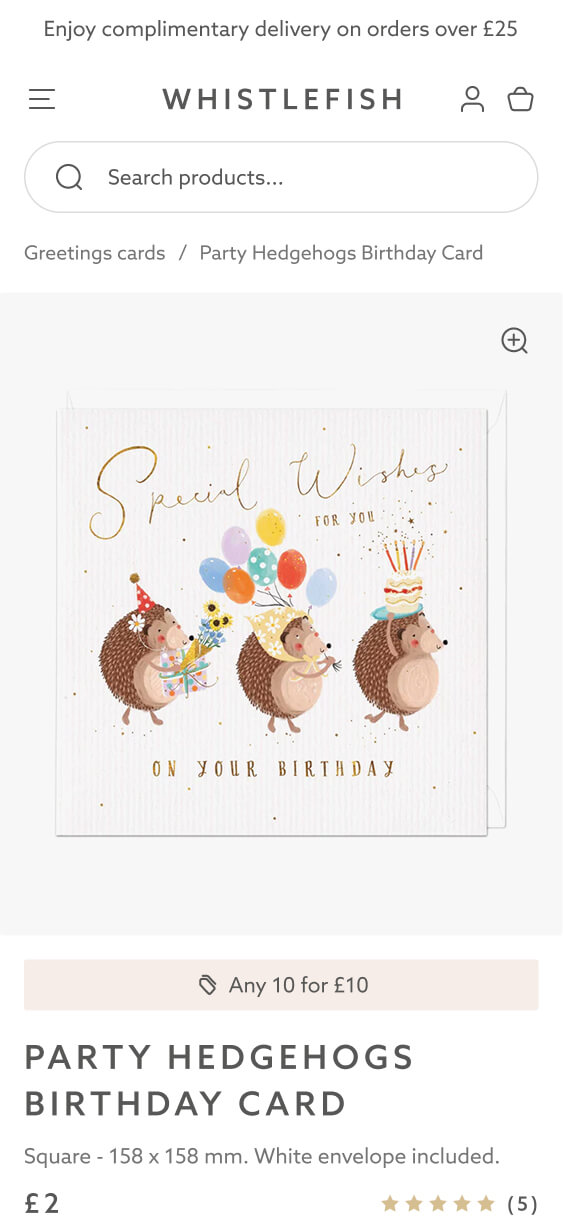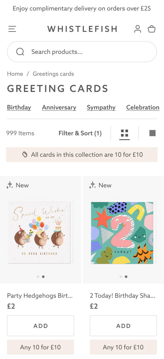 Whistlefish’s main products, greetings cards, are more lower priced products compared to most other Shopify stores I deal with. Popular bundles include “10 for £10” or “15 for £10” deals. So they needed a different collection page UX.
